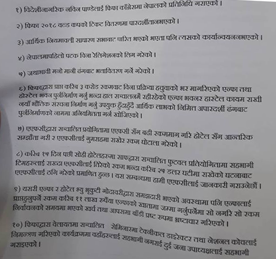 बिहीबार पुनः पत्रकार सम्मेलन गरी उनीहरुले विश्वकप टिकट बिक्रीमा अपादर्शिता भएको, मनोमानी भत्ता वितरण भएको, होस्टेलका लागि आएको रकममा हिनामिना भएको, जिल्ला संघको खर्च व्यक्तिगत रुपमा दिएको, महिला टेक्निकल सेन्टरको काम अपारदर्शी भएकोलगातका आरोप लगाएको छ ।