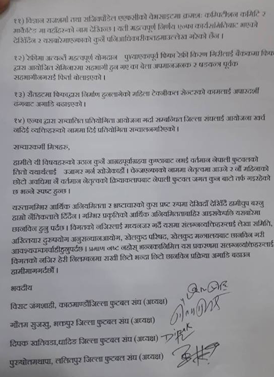 काठमाडौं जिल्ला फुटबल संघका अध्यक्ष विराट जंग शाही, भक्तपुर जिल्ला फुटबल संघका अध्यक्ष गौतम सुजखु, धादिङ जिल्ला फुटबल संघका अध्यक्ष दिपक खतिवडा र ललितपुर जिल्ला फुटबल संघका अध्यक्ष पुरुषोत्तम थापाले आग्रह पूर्वाग्रह र कुण्ठाबाट नभई फुटबलमा भइरहेका अनियमितताको यथार्थ ल्याएको बताएका छन् ।