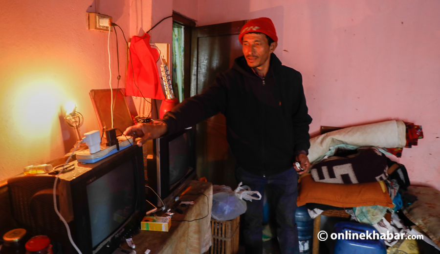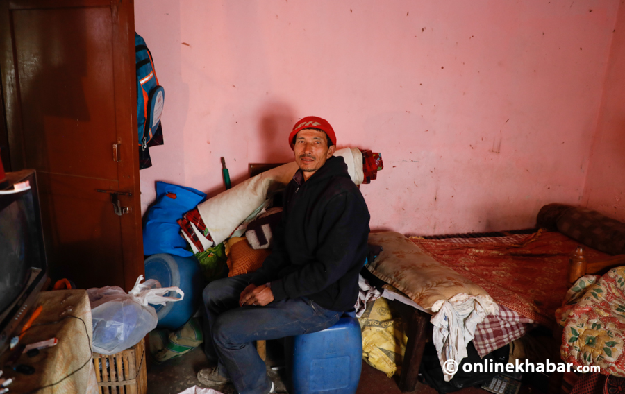 परिवारजन र तीनजना गाउँलेसहित रामबहादुरको यो कोठाले ६ जनाको ओत धानेको छ । कोठा भाडा तिर्छन् – मासिक चार हजार रुपैयाँ ।