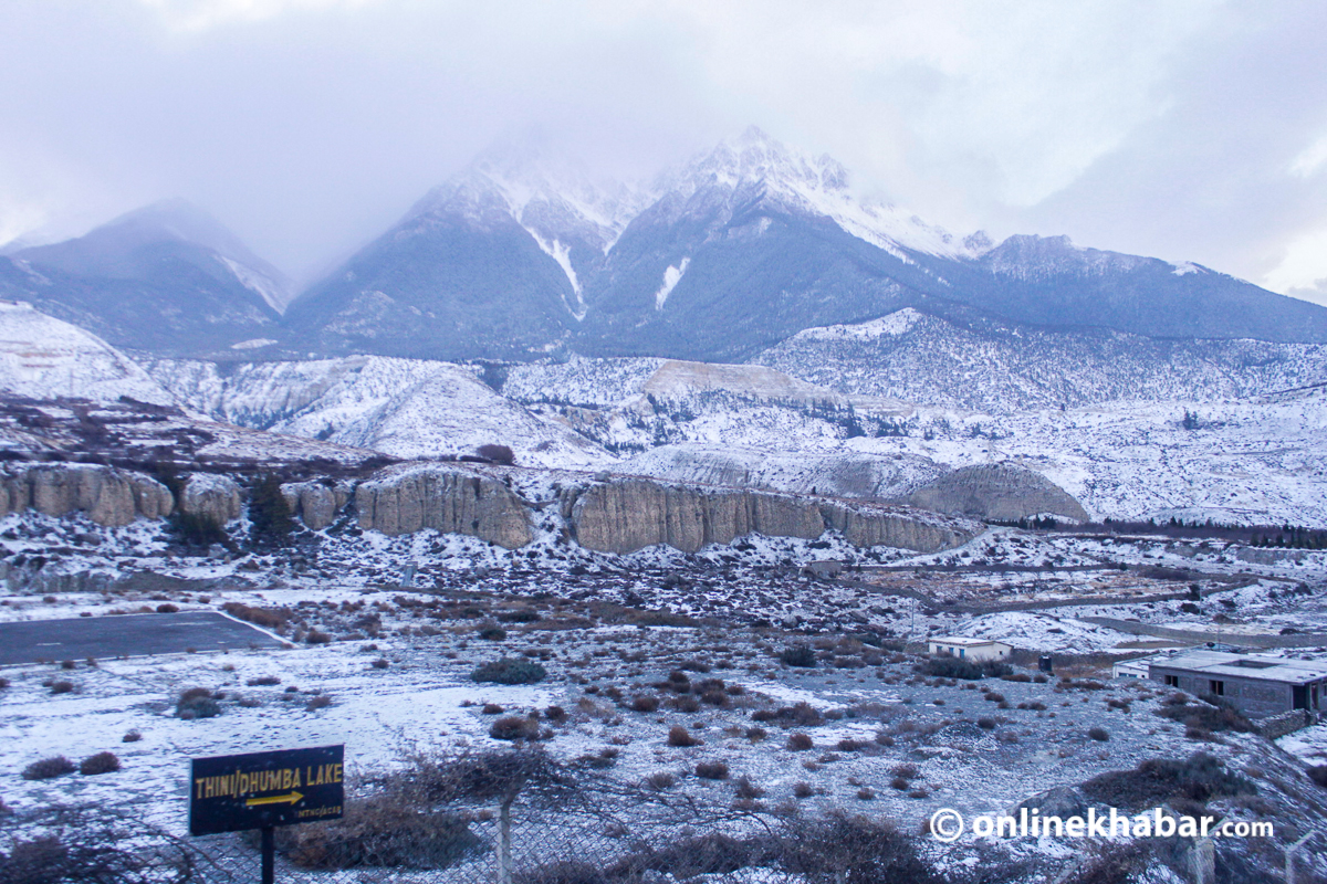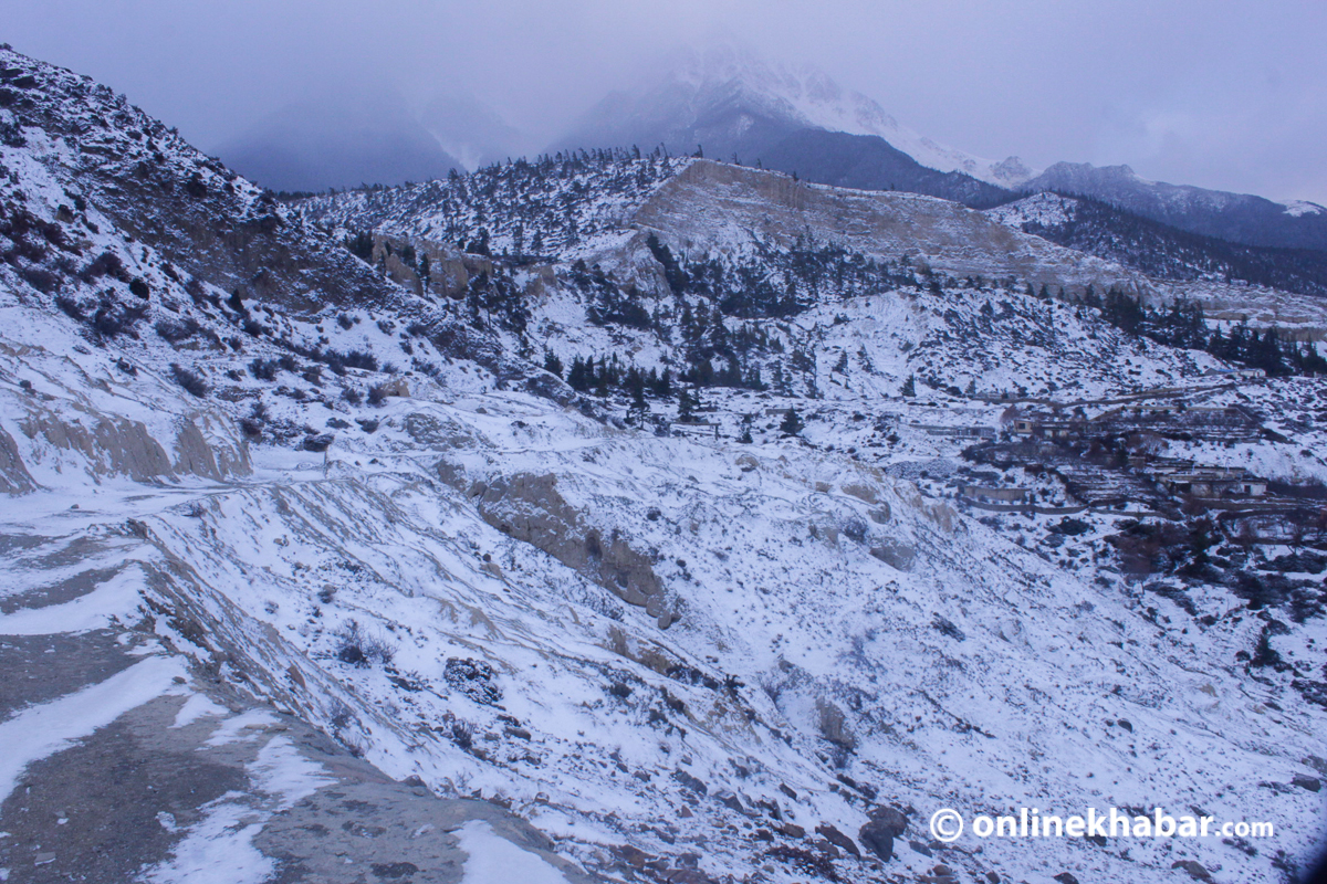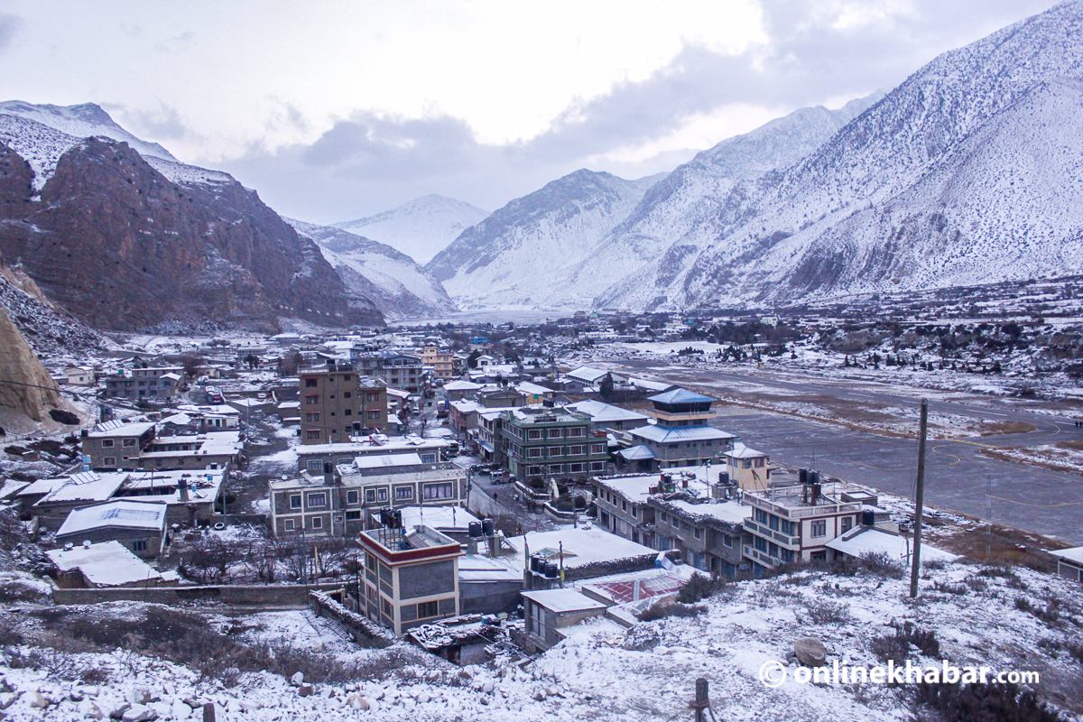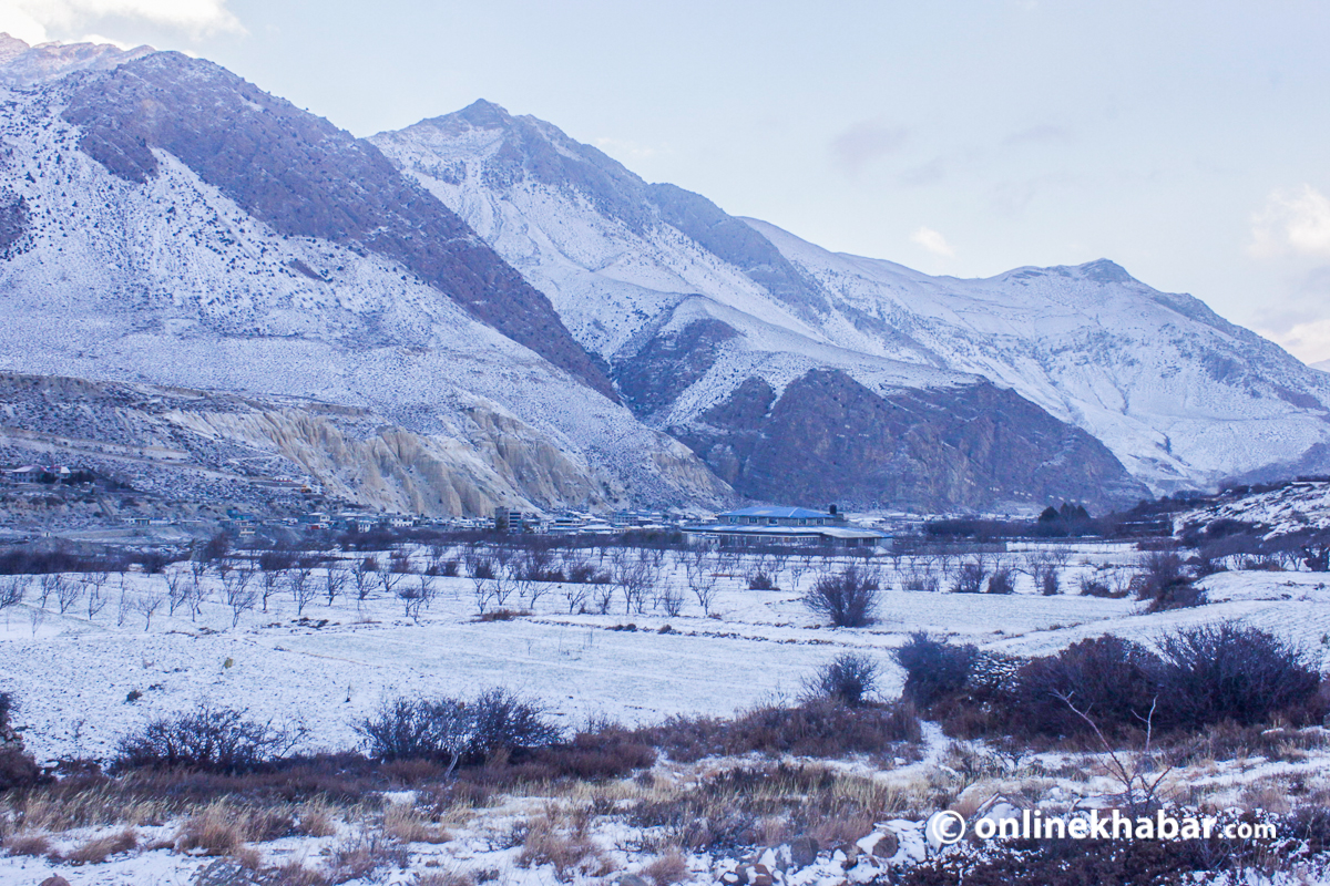 २३ पुस, जोमसोम । हिमालपारीको जिल्ला भनेर चिनिने मुस्ताङमा आइतबार साँझदेखि हिमपात सुरु भएको छ । यो वर्षमै पहिलोपटक हिउँ परेको हो ।