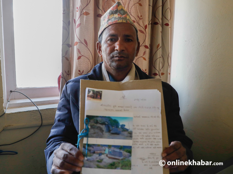 भुलले निवेदनमा दुईवटा फोटा पनि संलग्न गरेका छन्, जसमा खर र ढुंगाका छाना भएको वस्तीमाथि विकराल भीर देखिन्छ । लाग्छ, त्यो वस्ती नभएर भीरबाट खस्न लागेको सुख्खा पहिरो थाम्न बनाइएका दयनीय मानव संरचना हो ।