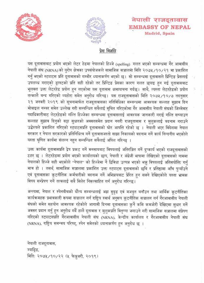 एनआरएनए युरोप उपसंयोजक एकराज गिरीले दूतावासको प्रिन्टिङ केयरलेसका बारेमा स्ट्याटस लेखेपछि दूतावासले मंगलबार कडा शब्दमा विज्ञप्ति प्रकाशित गरेको हो।
