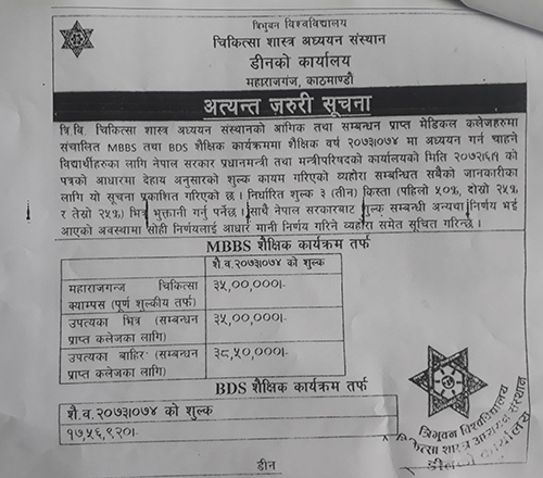 त्रिभुवन विश्वविद्यालय चिकित्सा शास्त्र अध्ययन संस्थानले काठमाडौं उपत्यकाभित्र र बाहिरका मेडिकल कलेजका लागि फरक शुल्क तोकेको छ । उपत्यकाबाहिर यसवर्ष एमबीबीएसमा भर्ना हुने विद्यार्थीका लागि ४२ लाख ४५ हजार रुपैयाँ शुल्क तोकिएको छ ।