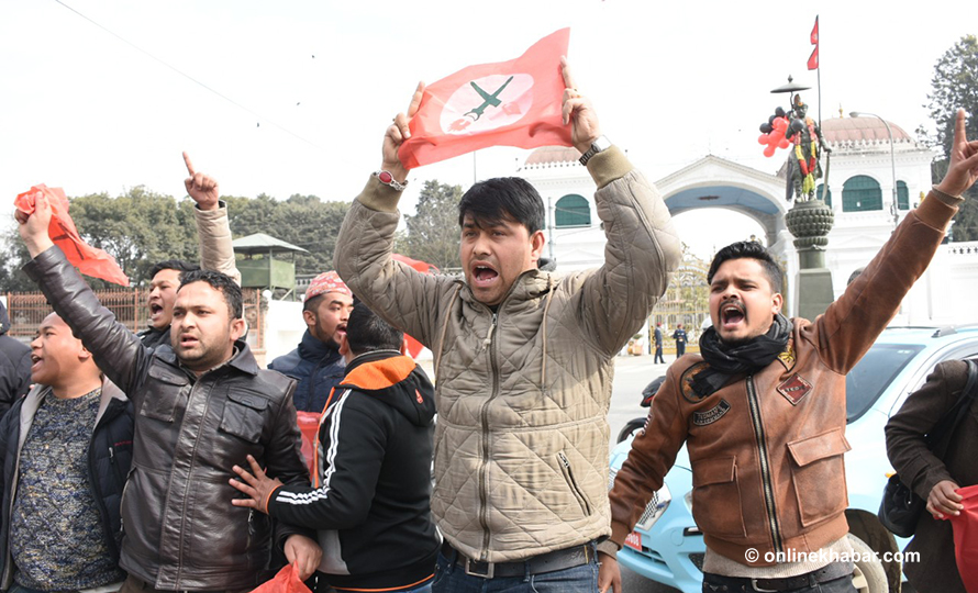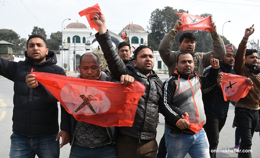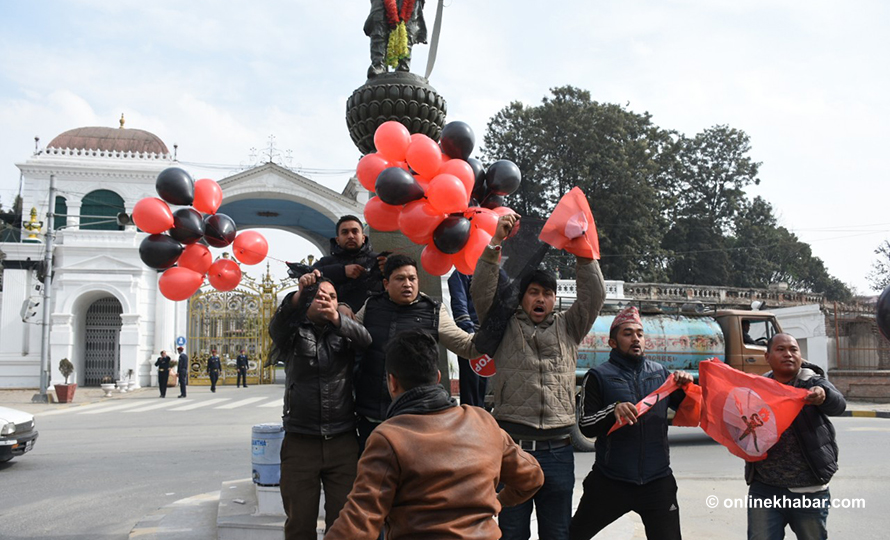 १८ माघ, काठमाडौं । बिभिन्न माग राखी सरकारको बिरोधमा उत्रिएको नेपाल विद्यार्थी संघले बेलुनमा झुण्ड्याएर सिंहदरबारमा कालो झण्डा उडाएको छ ।