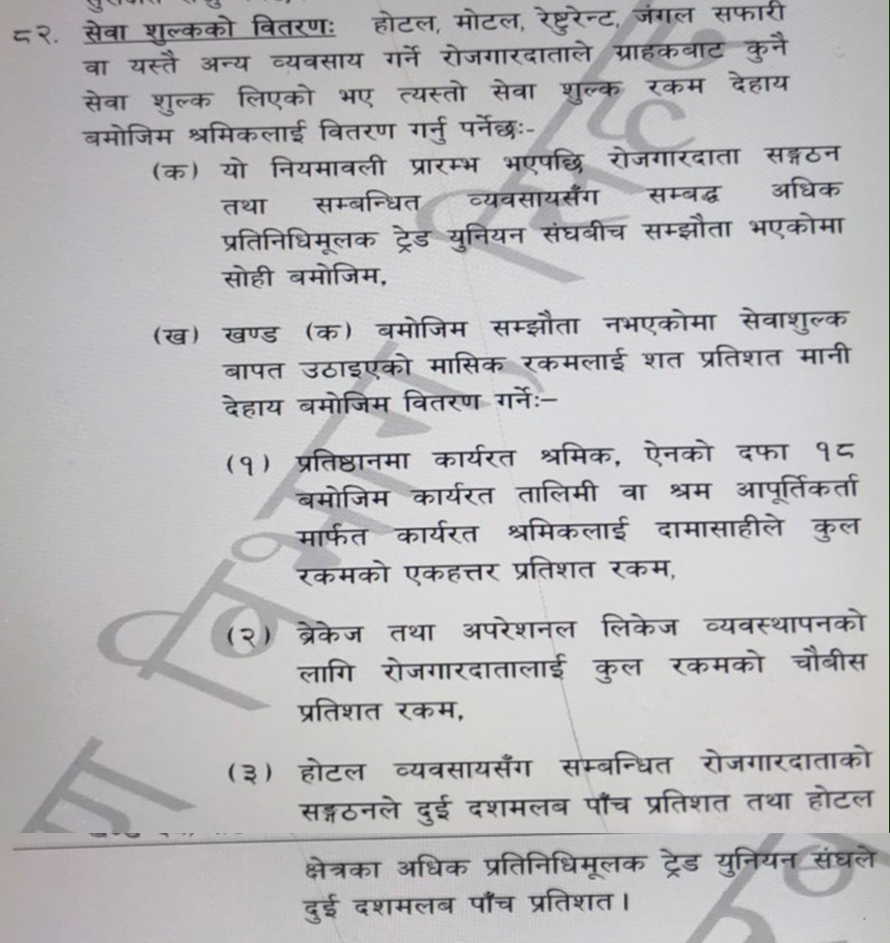 नियमावलीमा सेवा शुल्कबारे थप ब्याख्या गरिएको छ । नियमावलीको ८२ मा भनिएको छ, ‘होटल, मोटल, रेष्टुरेन्ट, जंगल सफारी वा यस्तै अन्य व्यवसाय गर्ने रोजगारदाताले ग्राहकबाट सेवा शुल्क दिएको भए…. श्रमिकलाई वितरण गर्नुपर्नेछ ।’