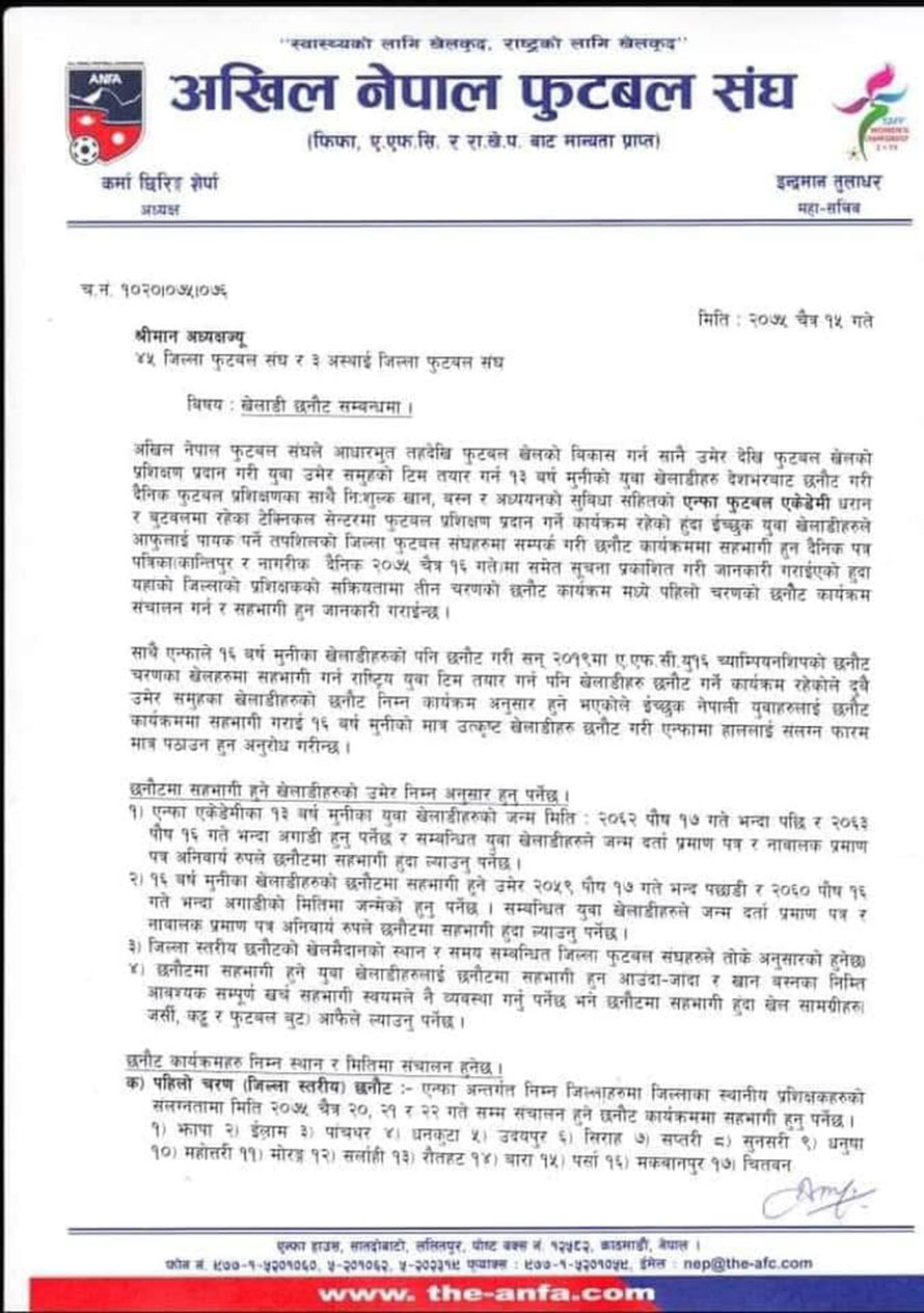 एन्फाले शुक्रबार ४५ वटा जिल्ला फुटबल संघ र तीन अस्थायी जिल्ला फुटबल संघलाई पत्र काट्दै स्थानीय तहमा १३ वर्षमुिन र १६ वर्षमुनिको गरी दुई उमेर समूहमा खेलाडी छनोट गर्न निर्देशन दिएको हो ।