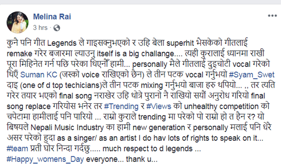 गीतमा अत्याधिक गाली आएपछि गायिका मेलिना राइले फेसबुकमा स्टाटस लेख्दै यो चलचित्रको टिमप्रति नै ‘घोर निन्दा गर्दछु’ भनेर उल्लेख गरेकी छिन् । उनले लेखेकी छिन्–‘कुनै पनि गीत लेजेन्डले गाइसक्नु भएको र उही बेला सुपरहिट भैसकेको गीतलाई रिमेक गरेर बजारमा ल्याउनु आफैमा चुनौतीको कुरा हो । त्यही कुरालाई ध्यानमा राखी पुरा मिहिनेत गर्न पछि परेका थिएनौ हामी । व्यक्तिगत रुपमा मैले यो गीतलाई २ पटक गाएको थिएँ । सुमन केसीले पनि तिनपटक आवाज दिनुभएको थियो तर उहाँको आवाज राखिएन । यति धेरै कुरा गरेर तयार भएको गीत नराखेर उही थोत्रे पुरानो नै राखियो । हामीले सयौं अनुरोध गर्यौ, तर गीत परिवर्तन भएन ।’