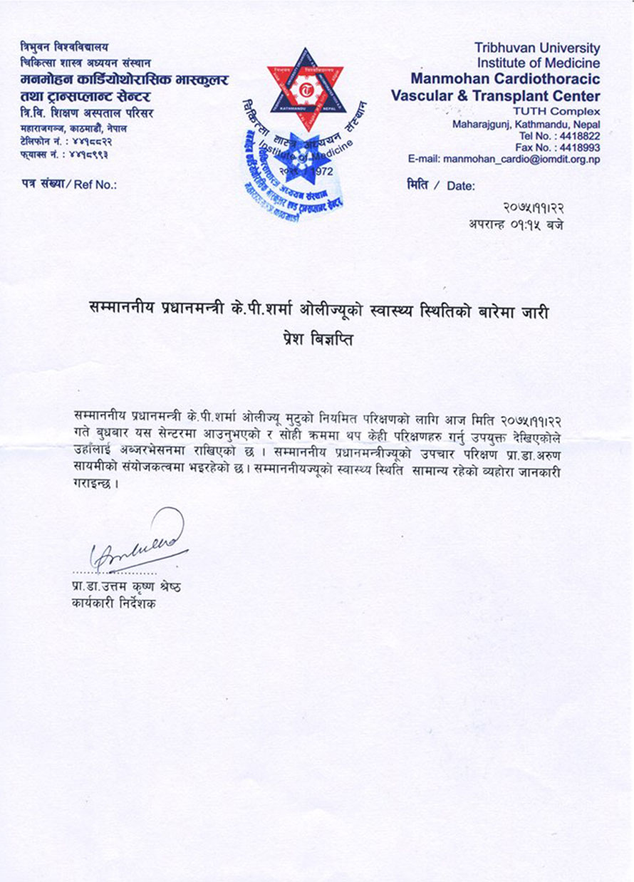 सेन्टरका कार्यकारी निर्देशक प्रा. डा. उत्तमकृष्ण श्रेष्ठले प्रधानमन्त्रीलाई अब्जरभेसनमा राखिएको जानकारी दिए । प्रधानमन्त्रीको केही थप परीक्षण गर्नु उपयुक्त देखिएकाले अब्जरभेसनमा राखिएको उनले बुधबार दिउँसो १ः१५ बजे विज्ञप्तिमार्फत जनाएका छन् ।