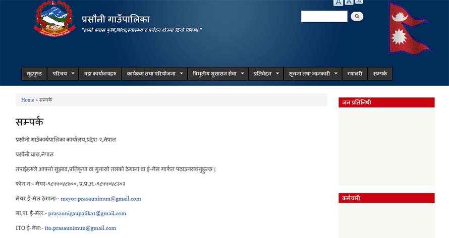 सरकारले ठूलो धनराशी खर्च गरेर सबै गाउँपालिकाहरुको वेबसाइट बनाएको छ । हामीले प्रसौनी गाउँपालिकाको वेबसाइटमा कार्यालयको टेलिफोन नम्बर खोज्यौं । त्यहाँ ‘सम्पर्क’ लेखिएको ठाउँमा गाउँपालिका अध्यक्ष गुप्ता र प्रशासकीय अधिकृत साहको मोबाइल नम्बरमात्रै रहेछ, कार्यालयको टेलिफोन भेटिएन ।