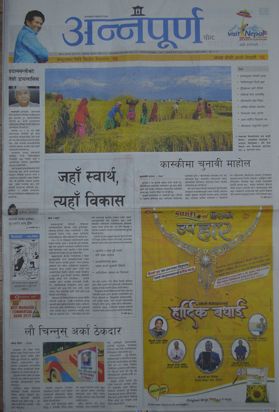 धान काट्दै गरेका पोखराका किसानको तस्वीर छापेको अन्नपूर्णले कास्की–२ को चुनावी माहोल तात्दै गएको लेखेको छ । प्रतिनिधिसभा सदस्यको उपनिर्वाचन हुन दुई साता बाँकी रहँदा सबै दलका उम्मेदवार मतदाताको घरदैलोमा पुगेको समाचारमा उल्लेख छ ।