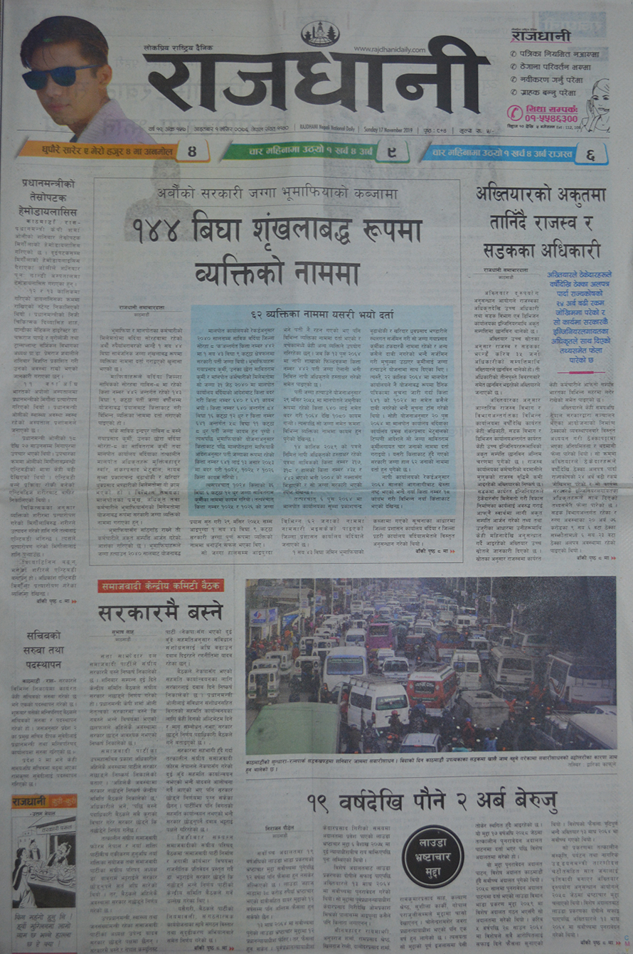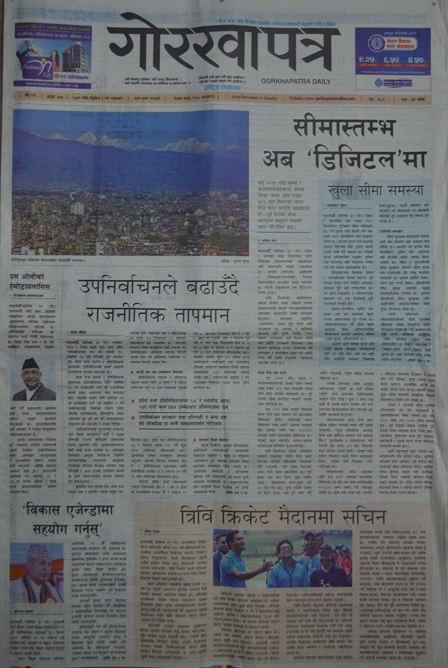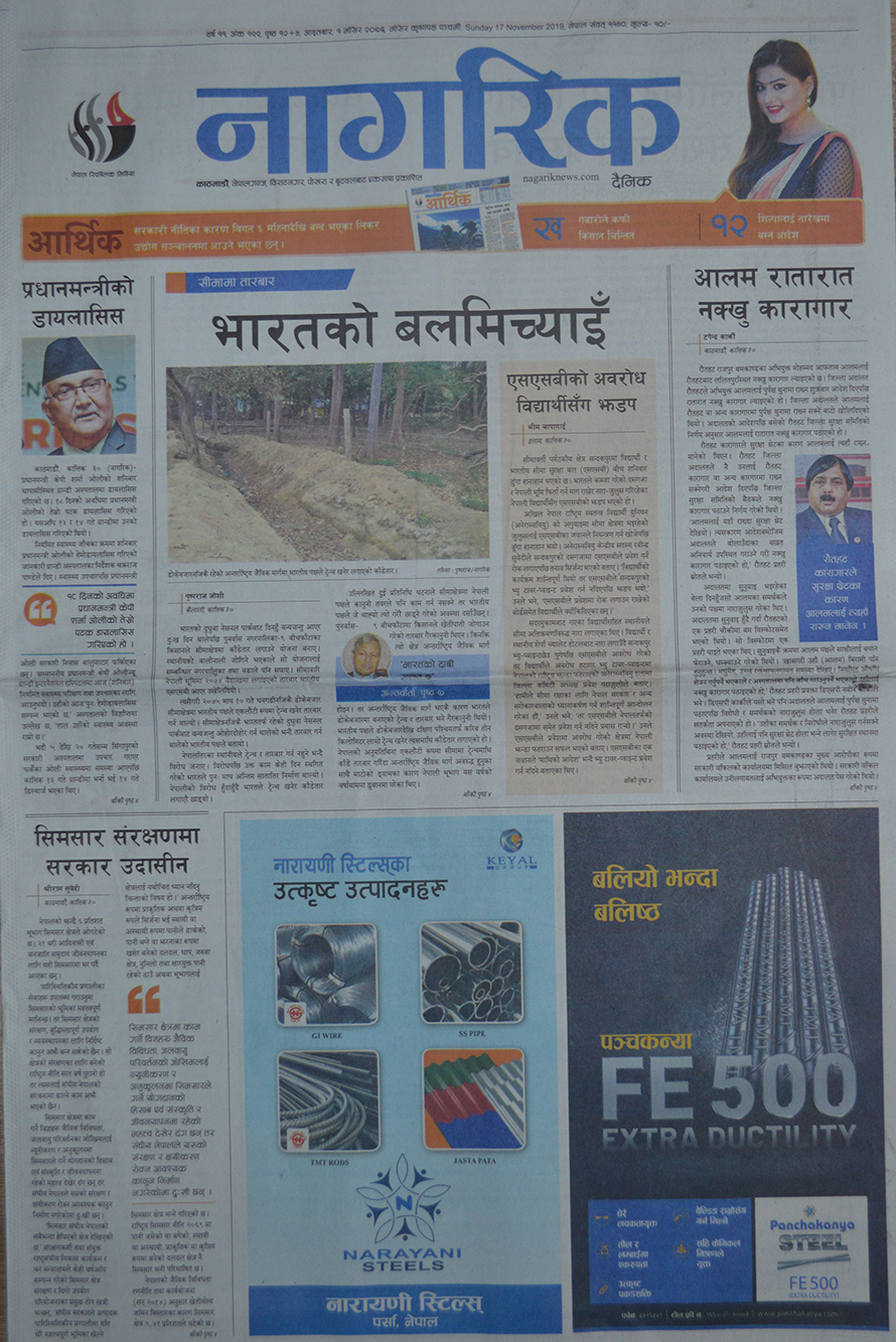 १ मंसिर, काठमाडौं । सीमा अतिक्रमण र शनिबार गरिएको प्रधानमन्त्री केपी शर्मा ओलीको डायलासिसलाई आजका दैनिक पत्रिकाहरूको प्राथमिकतामा परेको छ । त्यस्तै, बढ्दो सवारी दुर्घटना, सत्ताको आडमा मेडिकल कलेजले मच्चाएको ब्रह्मलुटलगायत विषयलाई पनि आजका पत्रपत्रिकाहरूले उठाएका छन् ।